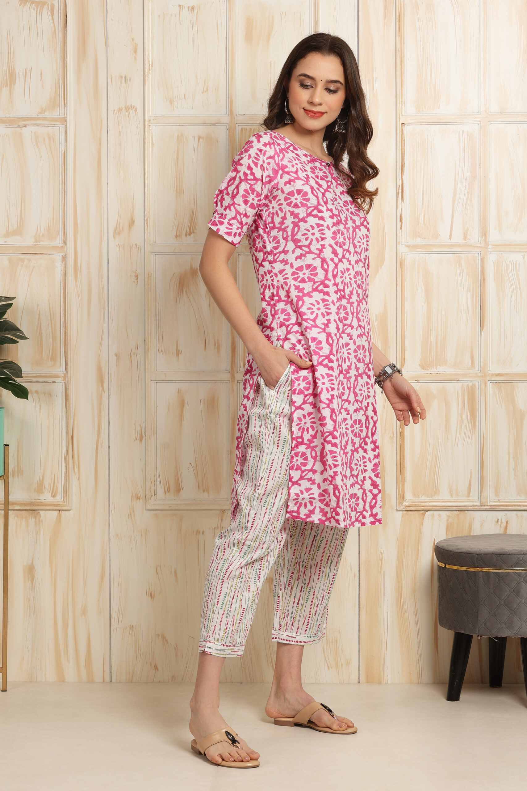 Pink Abstract Cotton Straight Kurta with Boatneck & Keyhole neckline and Geometric Printed Straight Pant with Pocket